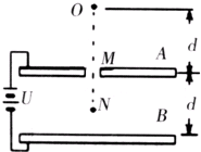 2、简答题 如图,A.B为平行板电容器,两板相距d,接在电压为U的电源上,在A板的中央有一小孔M(两板间电场可视为匀强电场).今有一质量为m的带电质点,自A板上方与A板相距也为d的O点由静止自由下落,穿过小孔M后到达距B板