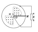 3、选择题 (2009年高考辽宁、宁夏理综卷)如图所示,一导体圆环位于纸面内,O为圆心.环内两个圆心角为90°的扇形区域内分别有匀强磁场,两磁场磁感应强度的大小相等,方向相反且均与纸面垂直.导体杆OM可绕O转动,M端通过滑动触点与圆环良好接触.在圆心和圆环间连有电阻R.杆OM以匀角速度ω逆时针转动,t=0时恰好在图示位置.规定从a到b流经电阻R的电流方向为正,圆环和导体杆的电阻忽略不计,则杆从t=0开始转动一周的过程中,电流随ωt变化的图象是( )