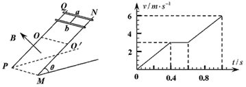 1、计算题  如图所示,两根质量均为0.1 kg完全相同的导体棒a、b,用绝缘轻杆相连置于由金属导轨PQ、MN架设的斜面上。已知斜面倾角θ为53°,a、b导体棒的间距是PQ、MN导轨间间距的一半,导轨间分界线OO′以下有方向垂直斜面向上的匀强磁场。当a、b导体棒沿导轨下滑时,其下滑速度v与时间的关系图像如下图所示。若a、b导体棒接入电路的电阻均为1Ω,其它电阻不计,取g=10 m/s2,sin53°=0.8,cos53°=0.6,试求: