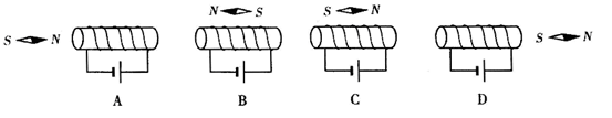 1、选择题 如图所示,在通电螺线管的磁场中,放有一个小磁针,当小磁针静止时,在下列各图中N极指向正确的是(?)