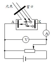 4、填空题 (4分)如图所示为研究光电效应的电路图,对于某金属用紫外线照射时,电流表指针发生偏转。将滑动变阻器滑动片向右移动的过程中,电流表的示数不可能? _(选填“减小”、“增大”)。 如果改用频率略低的紫光照射,电流表? _(选填“一定”、“可能”或“一定没”)有示数。