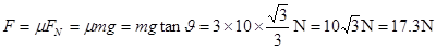 5、计算题 一个质量m=3kg的物体放在一长木板上,当木板一端抬起使它与水平方向成θ=30°时,物体正好可以沿板面匀速下滑。当木板水平放置时,用多大的水平拉力才能将物体拉动?(设物体受到的最大静摩擦力等于滑动摩擦力)