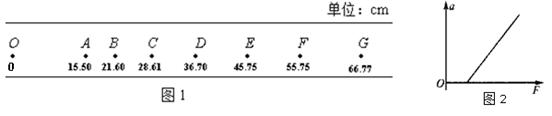 (3)在某一次测量中得到如图1所示纸带,A,B,C,D,E,F,G为6个计数点,各点到O点的距离已标在对应点下方(相邻计数点间有4个点未画出),请利用图示数据尽量精确地计算出加速度a=__________m/s2(保留3位有效数字)。若保持小车质量不变,根据实验数据该同学作出了加速度a随合力F的变化曲线,如图2所示.该图线不通过原点,请你分析其主要原因是?