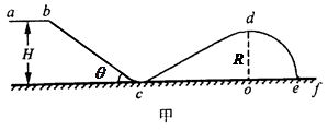 2、计算题 (12分) 滑板运动是一项陆地上的“冲浪运动”,滑板运动员可在不同的滑坡上滑行,做出各种动作给人以美的享受。如图甲所示,abcdef为同一竖直平面上依次平滑连接的滑行轨道,其中ab段水平,H=3m,bc段和cd段均为斜直轨道,倾角θ=37?,de段是一半径R=2.5m的四分之一圆弧轨道,O点为圆心,其正上方的d点为圆弧的最高点,滑板及运动员总质量m=60kg,运动员滑经d点时轨道对滑板支持力用Nd表示,忽略摩擦阻力和空气阻力,取g=10m/s2,sin37?=0.6,cos37?=0.8。除下述问(2)中运动员做缓冲动作以外,均可把滑板及运动员视为质点。
