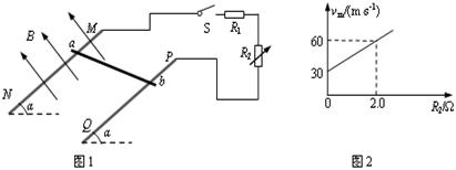 37°时,金属棒能达到的最大速度vm随电阻箱R2阻值的变化关系如图2所示。取g = 10m/s2,sin37°= 0.60,cos37°= 0.80。求定值电阻的阻值R1和金属棒的质量m。
