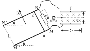 3、计算题 (18分)如图为某同学设计的速度选择装置,两根足够长的光滑导轨MM/和NN/间距为L与水平面成θ角,上端接滑动变阻器R,匀强磁场B0垂直导轨平面向上,金属棒ab质量为m恰好垂直横跨在导轨上。滑动变阻器R两端连接水平放置的平行金属板,极板间距为d,板长为2d,匀强磁场B垂直纸面向内。粒子源能发射沿水平方向不同速率的带电粒子,粒子的质量为m0,电荷量为q,ab棒的电阻为r,滑动变阻器的最大阻值为2r,其余部分电阻不计,不计粒子重力。
