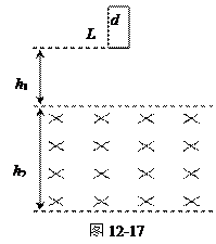 5、计算题 如图12-17所示,一质量为m=0.016kg、长L=0.5m、宽d=0.1m、电阻R=0.1Ω的矩形线圈,从h1=5m的高处由静止开始下落,然后进入匀强磁场,当下边进入磁场时,由于磁场力的作用,线圈正好作匀速运动。