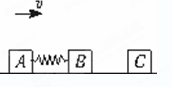 2、计算题 (8分)两物块A、B用轻弹簧相连,质量均为2 kg,初始时弹簧处于原长,A.B两物块都以v=6 m/s的速度在光滑的水平地面上运动,质量1 kg的物块C静止在前方,如图所示。B与C发生弹性碰撞。求在以后的运动中: