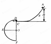 3、计算题 如图所示,ABC和DEF是在同一竖直平面内的两条光滑轨道,其中ABC的末端水平,DEF是半径为r=0.4m的半圆形轨道,其直径DF沿竖直方向,C、D可看作重合.现有一质量为m=1kg可视为质点的小球从轨道ABC上距C点高为H的地方由静止释放,