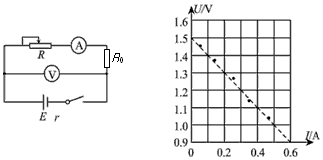 3、实验题 某同学按如图所示的电路测一节干电池的电动势E和内阻r,为防止调节滑动变阻器时由于电流过大而损坏仪器,电路中用了一个保护电阻R0。实验中除干电池、开关、导线外还有下列器材可供选用:
