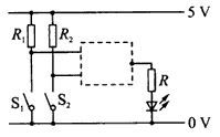 1、其他 如图是应用某种逻辑电路制作的车门报警电路。图中的两个按钮开关分别装在汽车的两扇门上。只要任何一个开关处于开路状态(输入为逻辑1,那么输出也是逻辑1),发光二极管(警报灯)就发光。请你根据要求,在电路图的虚线框内画出门电路符号。
