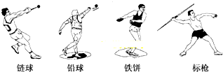 4、选择题 第30届夏季奥林匹克运动会于2012年7月28日至8月13日在伦敦斯特拉特福德奥林匹克体育场举行.奥运会中的投掷链球、铅球、铁饼和标枪等体育比赛项目都是把物体斜向上抛出的运动,如图所示.这些物体从被抛出到落地的过程中( )