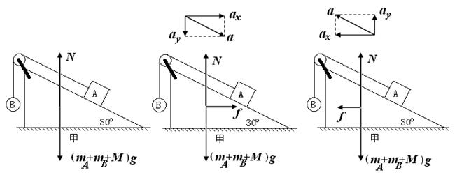 本题解析:当A沿斜面运动时,对甲图整体分析受力,如图所示,当A沿斜面匀速下滑时,物体平衡,整体F合=0,故地面对甲的摩擦力为零,当A沿斜面加速下滑时,将加速度分解,则水平方向有水平向右的静摩擦力的作用,故地面对甲的摩擦力方向水平向右,当A沿斜面加速上滑时,将加速度分解,则水平方向有水平向左的静摩擦力作用