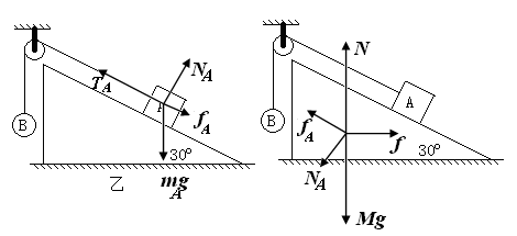 当当A沿斜面加速上滑时,对乙图中的A物体和斜面体进行受力,如图所示,由斜面体处于平衡状态,则地面对乙的摩擦力方向向右,故C选项错误;由排除法知ABC选项均错,则只有D选项正确。