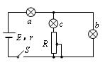 3、选择题 如图所示的电路,闭合开关S后,a、b、c三盏灯均能发光,电源电动势E恒定且内阻r不可忽略。现将变阻器R的滑片稍向上滑动一些,三盏灯亮度变化的情况是(?)