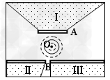 3、选择题 如图所示,O是水面上一波源,实线和虚线分别表示某时刻的波峰和波谷,A是挡板,B是小孔。若不考虑波的反射因素,则经过足够长的时间后,水面上的波将分布于