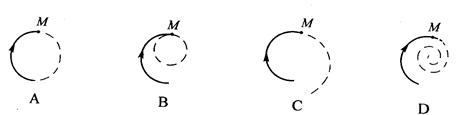 1、选择题 在匀强磁场中有带电粒子作匀速圆周运动,当它运动到M点,突然与不带电的静止粒子碰撞合为一体,碰撞后的运动运动轨迹是图中那一个(实线为原轨迹,虚线为碰后轨迹,且不计粒子的重力)