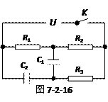 2、简答题 如图7-2-16所示,U=10V,电阻R1=3Ω,R2=2Ω,R3=5Ω,电容器的电容C1=4μF,C2=1μF,求: