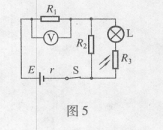 3、选择题 在如图5所示的电路中,E为电源,其内阻为r,L为小灯泡(其灯丝电阻呵视为不变),R1、R2为定值电阻,R3为光敏电阻,其阻值:犬小随所受照射光强度的增大而减小,V为理想电压表。若将照射R3的光的强度减弱,则?(?)