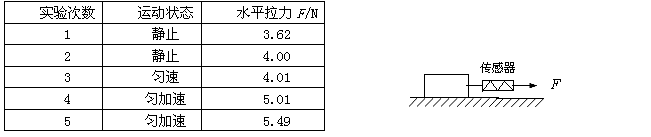 2、计算题 在探究摩擦力的实验中采用了如下的操作,将一个长方体木块放在水平桌面上,然后用一个力传感器对木块施加一个水平拉力F,并用另外一个传感器对木块的运动状态进行监测,表1是其记录的实验数据。木块的重力为10.00N,重力加速度g=9.80m/s2,根据表格中的数据回答下列问题(保留3位有效数字):