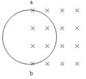 2、选择题 如图所示,用粗细均匀的阻值为R的金属丝做成面积为S的圆环,它有一半处于匀强磁场中,磁场方向垂直纸面向里,磁场均匀变化,磁感应强度大小随时间的变化率为k(k>0),ab为圆环的一条直径,则下列说法正确的是: