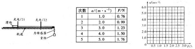 5、实验题 为了探究加速度与力的关系,某同学设计了如图所示的实验装置,带滑轮的长木板水平放置,板上有两个光电门相距为d,滑块通过细线与重物相连,细线的拉力F大小等于力传感器的示数.让滑块从光电门1由静止释放,记下滑到光电门2的时间t,改变重物质量来改变细绳拉力大小,重复以上操作5次,得到下列表格中5组数据.