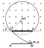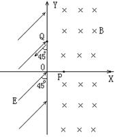 2、计算题 在图示区域中,Y轴右方有一匀强磁场,磁感应强度的方向垂直纸面向里,大小为B,Y轴左方有匀强电场区域,该匀强电场的强度大小为E,方向与y轴夹角为450且斜向右上方。有一质子以速度v0由X轴上的P点沿X轴正方向射入磁场,质子在磁场中运动一段时间以后从Q点进入Y轴左方的匀强电场区域中,在Q点质子速度方向与Y轴负方向夹角为45°,已知质子的质量为m,电量为q,不计质子的重力,(磁场区域和电场区域足够大)求: