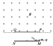 3、计算题  如图所示,MN、PQ是平行金属板,板长为L,两板间距离为,PQ板带正电,MN板带负电,在PQ板的上方有垂直纸面向里的匀强磁场。一个电荷量为q、质量为m的带负电粒子以速度v。从MN板边缘沿平行于板的方向射入两板间,结果粒子恰好从PQ板左边缘飞进磁场,然后又恰好从PQ板的右边缘飞进电场。不计粒子重力。求: