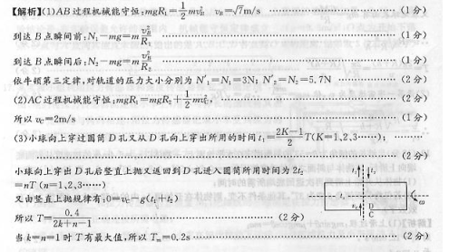 2、计算题  如图所示,质量为m=0.1kg可视为质点的小球从静止开始沿半径为R1=35cm的圆弧轨道AB由A点滑到B点后,进入与AB圆滑连接的圆弧管道BC,管道出口为C,圆弧管道半径为R2=15cm,在紧靠出口C处,有一水平放置且绕其水平轴线匀速旋转的圆筒(不计筒皮厚度),筒上开有小孔D,筒旋转时,小孔D恰好能经过出口C处,若小球射出C出口时,恰好能接着穿过D孔,并且还能再从D孔向上穿入圆筒,小球返回后又先后两次向下穿过D孔而未发生碰撞,不计摩擦和空气阻力,取g=10m/s2,问: