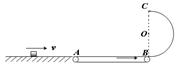 1、计算题 如图所示,水平传送带右端与竖直放置的光滑半圆形轨道在B点相切,半圆形轨道半径为R=0.4m。物块在与传送带等高的左侧平台上以4m/s的速度从A点滑上传送带。物块质量m=0.2kg,物块与传送带的动摩擦因数μ=0.4,g取10m/s2。