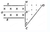 3、计算题 如图所示,两平行金属板AB中间有互相垂直的匀强电场和匀强磁场。A板带正电荷,B板带等量负电荷,板间电场强度为E;磁场方向垂直纸面向里,磁感应强度为B1。平行金属板右侧有一挡板M,中间有小孔O′,OO′是平行于两金属板的中心线。挡板右侧有垂直纸面向外的匀强磁场,磁场应强度为B2。CD为磁场B2边界上的一绝缘板,它与M板的夹角θ=45°,O′C=a,现有大量质量均为m,含有不同电荷量、不同速度的正、负带电粒子(不计重力),自O点沿OO′方向进入电磁场区域,其中有些粒子沿直线OO′方向运动,并进入匀强磁场B2中,求: