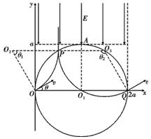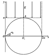 3、计算题  如图所示,在坐标系xOy内有一半径为a的圆形区域,圆心坐标为O1(a,0),圆内分布有垂直纸面向里的匀强磁场。在直线y=a的上方和直线x=2a的左侧区域内,有一沿y轴负方向的匀强电场,场强大小为E。一质量为m、电荷量为+q(q>0)的粒子以速度v从O点垂直于磁场方向射入,当速度方向沿x轴正方向时,粒子恰好从O1点正上方的A点射出磁场,不计粒子重力。