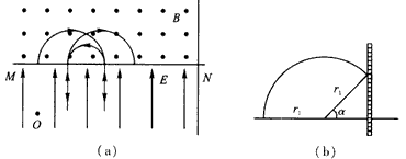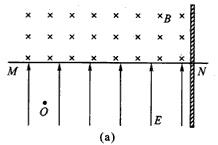2、计算题  如图(a)所示,水平直线MN下方有竖直向上的匀强电场,现将一重力不计、比荷的正电荷置于电场中的O点由静止释放,经过时间以后,电荷以v0=1.5×104m/s的速度通过MN进入其上方的均匀磁场,磁场与纸面垂直,磁感应强度B按图(b)所示规律周期性变化[图(b)中磁场以垂直纸面向里为正,以电荷第一次通过MN时为t=0时刻]。求: