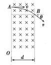 3、计算题 (12分)如图所示,一束电子的电荷量为e,以速度v垂直左边界射入磁感应强度为B、宽度为d的有界匀强磁场中,穿过磁场时的速度方向与原来电子的入射方向的夹角θ是30°,则电子的质量是多少?电子穿过磁场的时间又是多少?