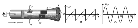 1、选择题  图示为示波管构造的示意图,现在xx"上加上uxx"-t信号,yy"上加上uyy"-t信号(如图甲、乙所示),则在屏幕上看到的图形是