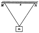 1、计算题 两根艮度相等的轻绳,下端悬挂一质量为m的物体,上端分别固定在水平天花板上的M、N点,M、N两点间的距离为x。如图所示,已知两绳所能承受的最大拉力均为FT,则每根绳的长度不得短于多少?