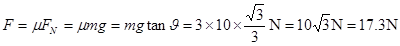 5、计算题 一个质量m=3kg的物体放在一长木板上,当木板一端抬起使它与水平方向成θ=30°时,物体正好可以沿板面匀速下滑。当木板水平放置时,用多大的水平拉力才能将物体拉动?(设物体受到的最大静摩擦力等于滑动摩擦力)