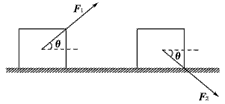出门旅行时,在车站、机场等地有时会看见一些旅客推着行李箱,也有一些旅客拉着行李箱在地面上行走。为了了解两种方式哪种省力,我们作以下假设:行李箱的质量为m=10kg,拉力F1、推力F2与水平方向的夹角均为θ=37°(如图所示),行李箱与地面间为滑动摩擦力,动摩擦因数为μ=0.2,行李箱都做匀速运动。试通过定量计算说明是拉箱子省力还是推箱子省力。