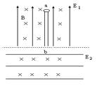 4、简答题  如图所示,虚线上方有场强为E1=6×104N/C的匀强电场,方向竖直向上,虚线下方有场强为E2的匀强电场,电场线用实线表示,另外,在虚线上、下方均有匀强磁场,磁感应强度相等,方向垂直纸面向里,ab是一长为L=0.3m的绝缘细杆,沿E1电场线方向放置在虚线上方的电、磁场中,b端在虚线上,将一套在ab杆上的带电量为q=-5×10-8C的带电小环从a端由静止释放后,小环先作加速运动而后作匀速运动到达b端,小环与杆间的动摩擦因数μ=0.25,不计小环的重力,小环脱离ab杆后在虚线下方仍沿原方向作匀速直线运动.