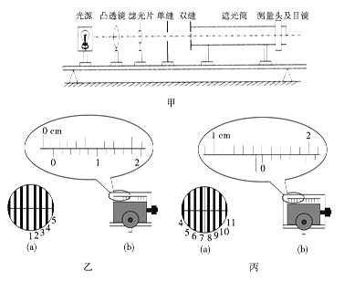 2、实验题 在“用双缝干涉测光的波长”实验中,将双缝干涉实验仪按要求安装在光具座上(如图甲所示),并选用缝间距d=0.20 mm的双缝屏。从仪器注明的规格可知,像屏与双缝屏间的距离L=700 mm。然后,接通电源使光源正常工作。