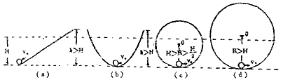 C.以初速v0沿半径为R的光滑圆轨道,从最低点向上运动(图c,H>R>H/2)