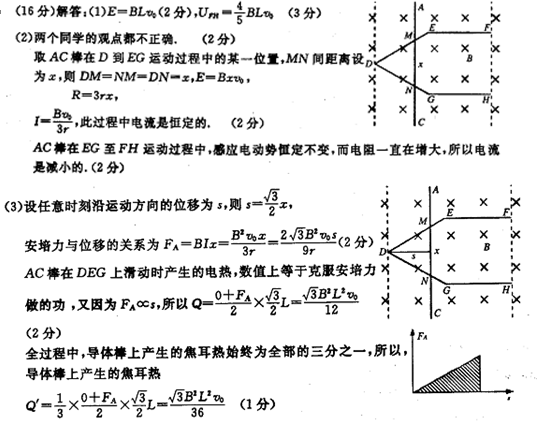 小题2:关于导体棒运动过程中回路产生感应电流,小明和小华两位同学进行了讨论.小明认?为导体棒在整个运动过程中是匀速的,所以回路中电流的值是恒定不变的;小华则认?为前一过程导体棒有效切割长度在增大,所以电流是增大的,后一过程导体棒有效切?割长度不变,电流才是恒定不变的.你认为这两位同学的观点正确吗?请通过推算证?明你的观点.