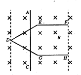 2、计算题  如图所示,在水平面上固定一光滑金属导轨HGDEF,EF∥GH,DE=EF=DG=GH=EG=L.一质量为m足够长导体棒AC垂直EF方向放置于在金属导轨上,导轨与导体棒单位长度的电阻均为r.整个装置处在方向竖直向下、磁感应强度为B的匀强磁场中.现对导体棒AC施加一水平向右的外力,使导体棒从D位置开始以速度v0沿EF方向做匀速直线运动,导体棒在滑动过程中始终保持与导轨良好接触.