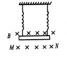 3、计算题 如图所示,一根长为L,质量m的铜棒MN,由两根相同的弹簧水平悬挂在匀强磁场中 ,磁感应强度为B,此时,弹簧伸长x0.当铜棒通以电流时,弹簧又伸长x0,求电流方向和电流强度.