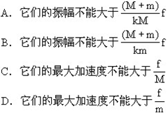 5、选择题 如图1所示,两木块A和B叠放在光滑水平面上,质量分别为m和M,A与B之间的最大静摩擦力为f,B与劲度系数为k的轻质弹簧连接构成弹簧振子。为使A和B在振动过程中不发生相对滑动,则 [ ]