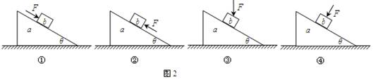 3、选择题 如图1所示,水平地面上有一楔形物块a,其斜面上静止一小物块b。现用力F沿不同方向作用在小物块b上,小物块b仍保持静止,如图2所示。则a、b之间的静摩擦力一定增大的是