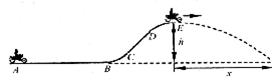 3、计算题 (14分)某同学利用玩具电动车模拟腾跃运动.如图所示,AB是水平地面,长度为L=6m,BC是半径为R=12m的圆弧,AB、BC相切于B点,CDE是一段曲面.玩具电动车的功率始终为P=10W,从A点由静止出发,经t=3s到达B点,之后通过曲面到达离地面h=1.8m的E点水平飞出,落地点与E点的水平距离x=2.4m.玩具电动车可视为质点,总质量为m=1kg,在AB段所受的阻力恒为2N,重力加速度g取10 m/s2,不计空气阻力.求: