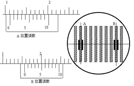 1、实验题 (6分)利用双缝干涉测定光的波长实验中,取双缝间距d="0.5mm," 双缝光屏间距离L=0.5m,用某种单色光照射双缝得到干涉图象如图,分划板在图中A、B位置时游标卡尺读数如图,则图中A位置的游标卡尺读数为?mm , ?B位置的游标卡尺读数为?mm , 单色光的波长为?m。