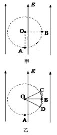 2、计算题 (12分) 如图甲所示,场强大小为E、方向竖直向上的匀强电场内存在着一半径为R的圆形区域,O点为该圆形区域的圆心,A点是圆形区域的最低点,B点是圆形区域最右侧的点。在A点有放射源释放出初速度大小不同、方向均垂直于场强向右的正电荷,电荷的质量均为m,电量均为q,不计重力。试求: