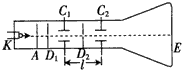 的最精确的方法之一是双电容法。如图所示,在真空管中由阴极K发射的电子,其初速度可忽略不计,此电子被阳极A的电场加速后穿过屏障D1上的小孔,然后依次穿过平行板电容器C1、屏障D2和第二个平行板电容器C2而射到荧光屏E上,阳极A与阴极K间的电势差为U。在电容器C1、C2之间加有频率为f的同步正弦交变电压,选择频率f使电子束在荧光屏上的亮点不发生偏转,且两电容器间的距离为l。试根据以上数据求出电子比荷。